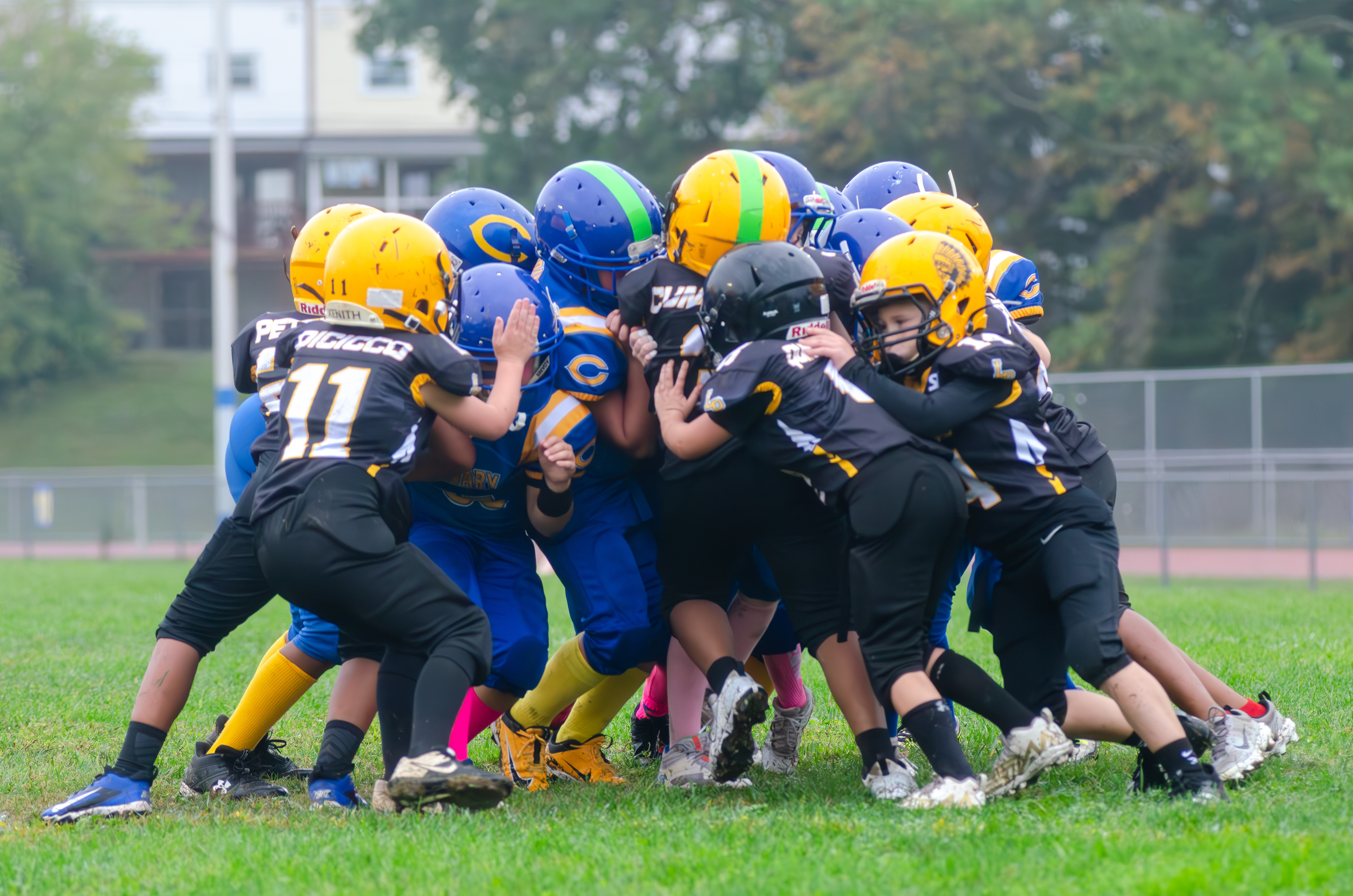 Great sports photography isn't just about the ball; it’s about the reaction. The photographer correctly identified that the story was happening after the goal, shifting focus to the huddle of celebrating players. This shot is a masterclass in storytelling through contrast. On the left, we see the bright blue huddle of joy; on the right, the white-shirted opponent walks away in dejection. It captures the dual nature of competition in one frame.